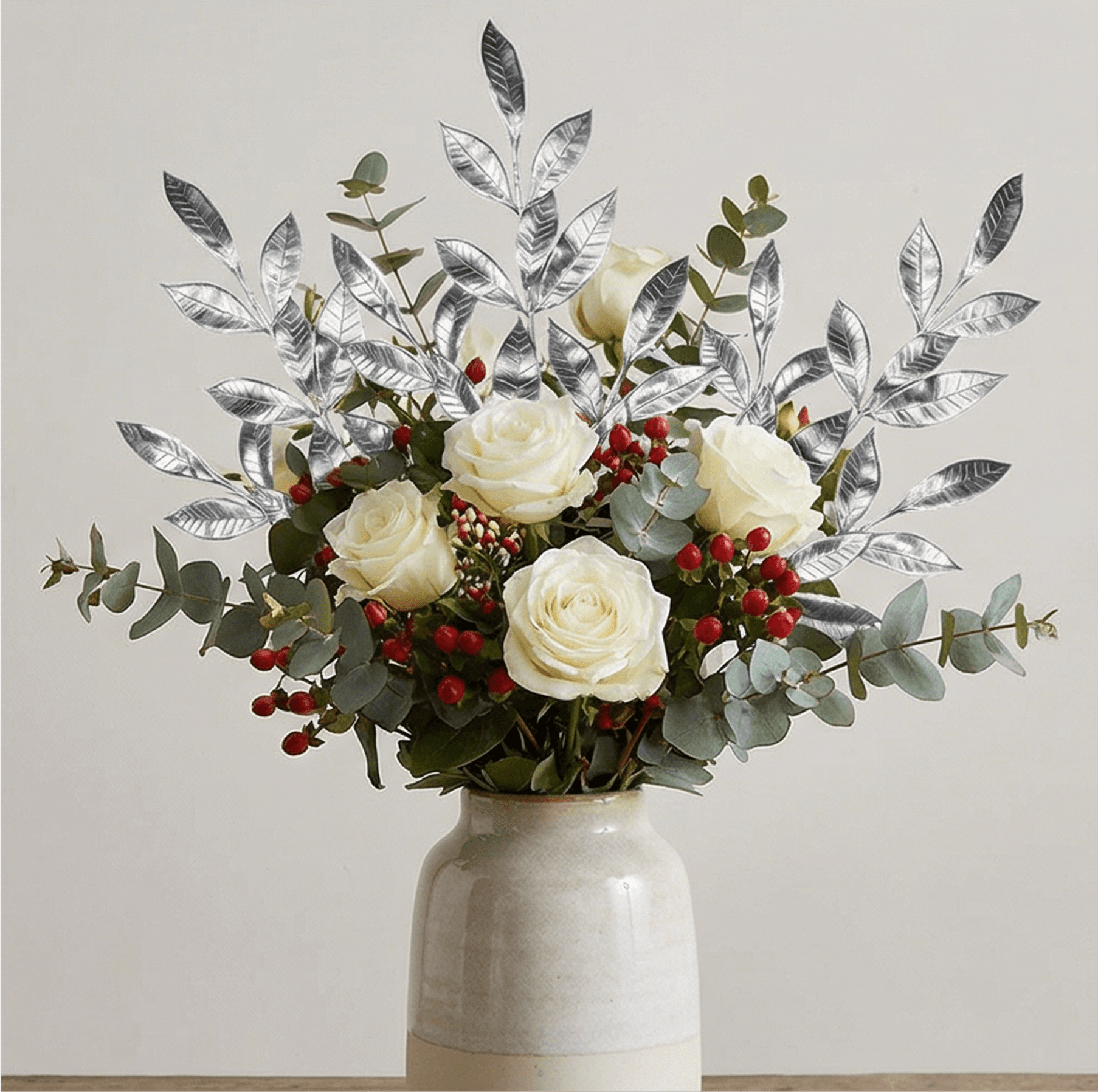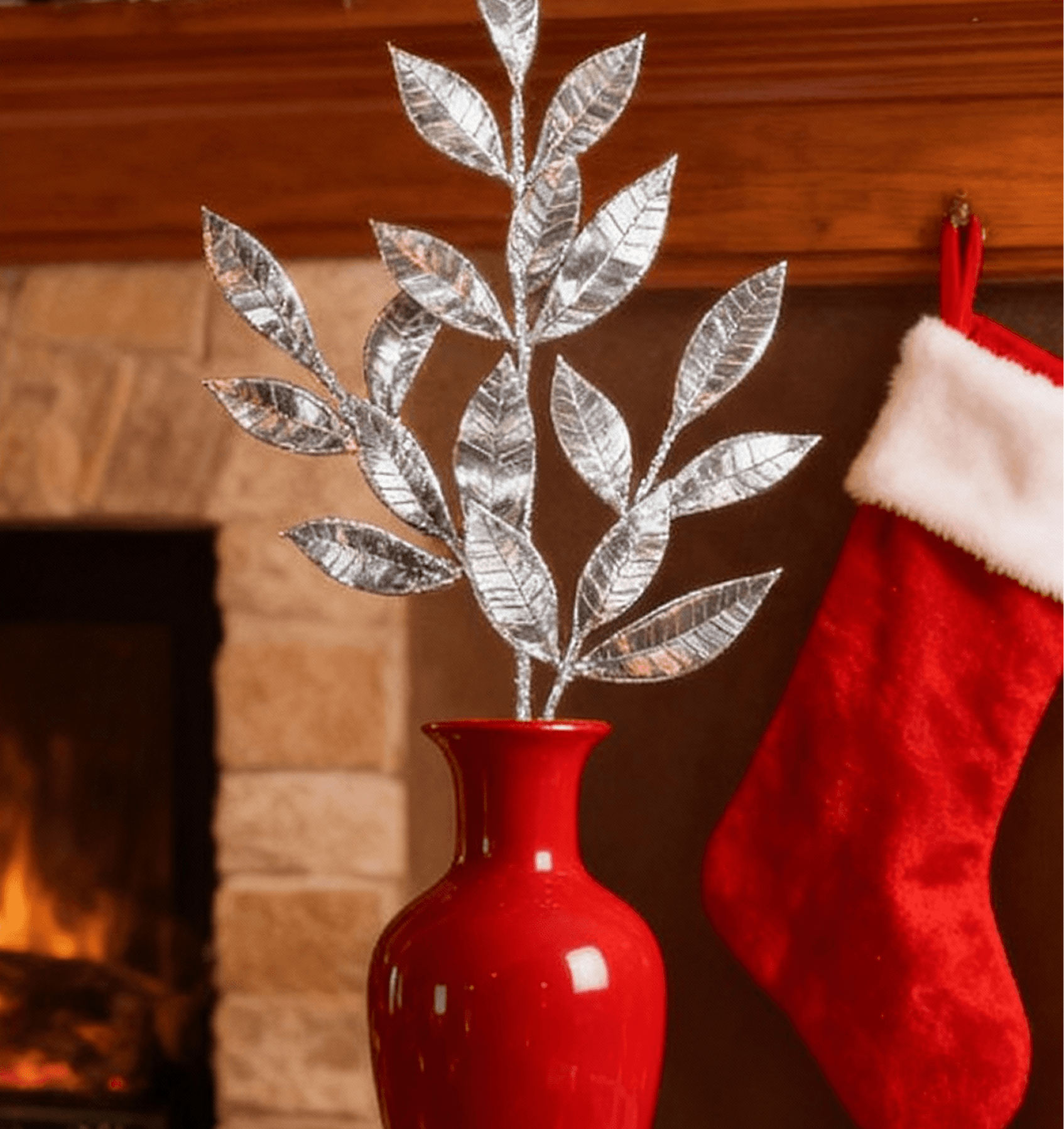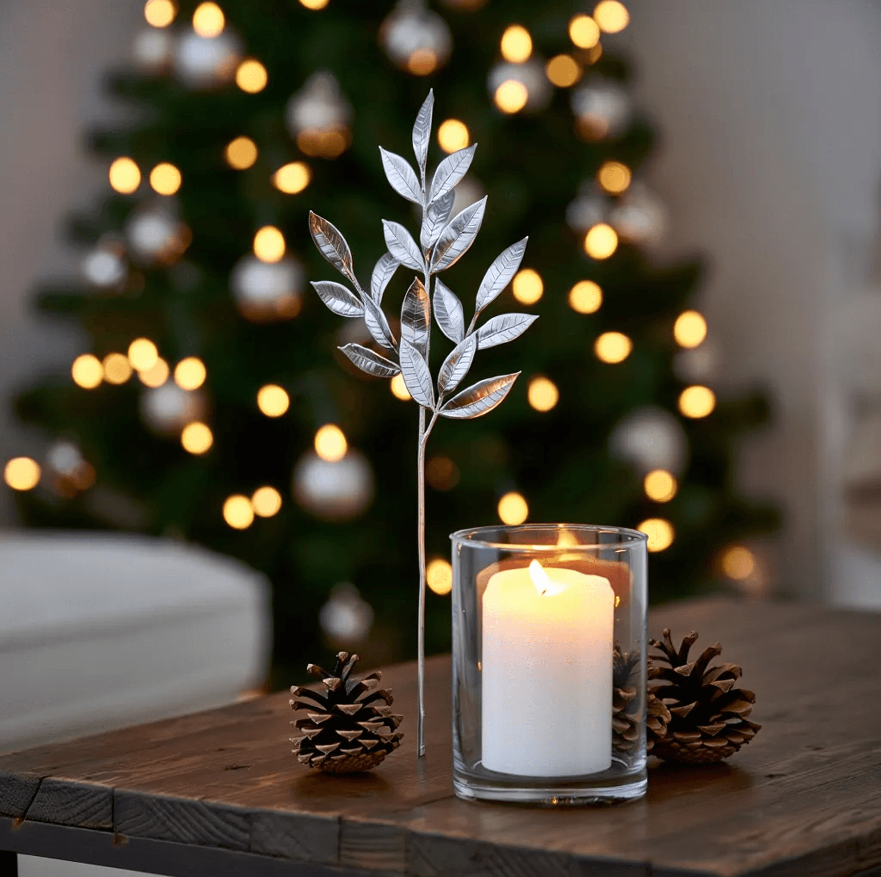-Decoración Elegante y Festiva: Rama navideña en tono plateado diseñada para añadir brillo y sofisticación a árboles, coronas, centros de mesa o arreglos decorativos.