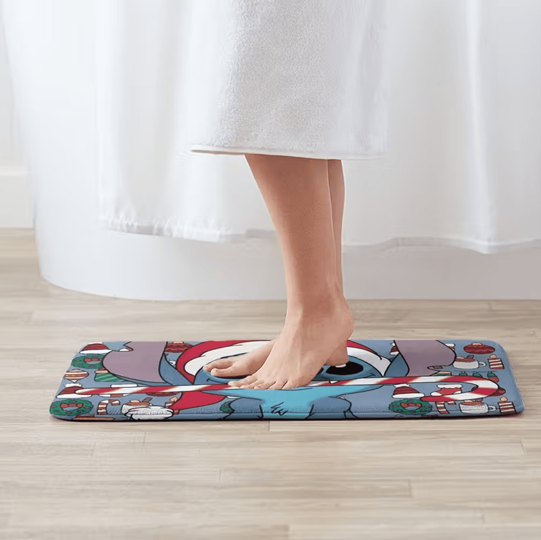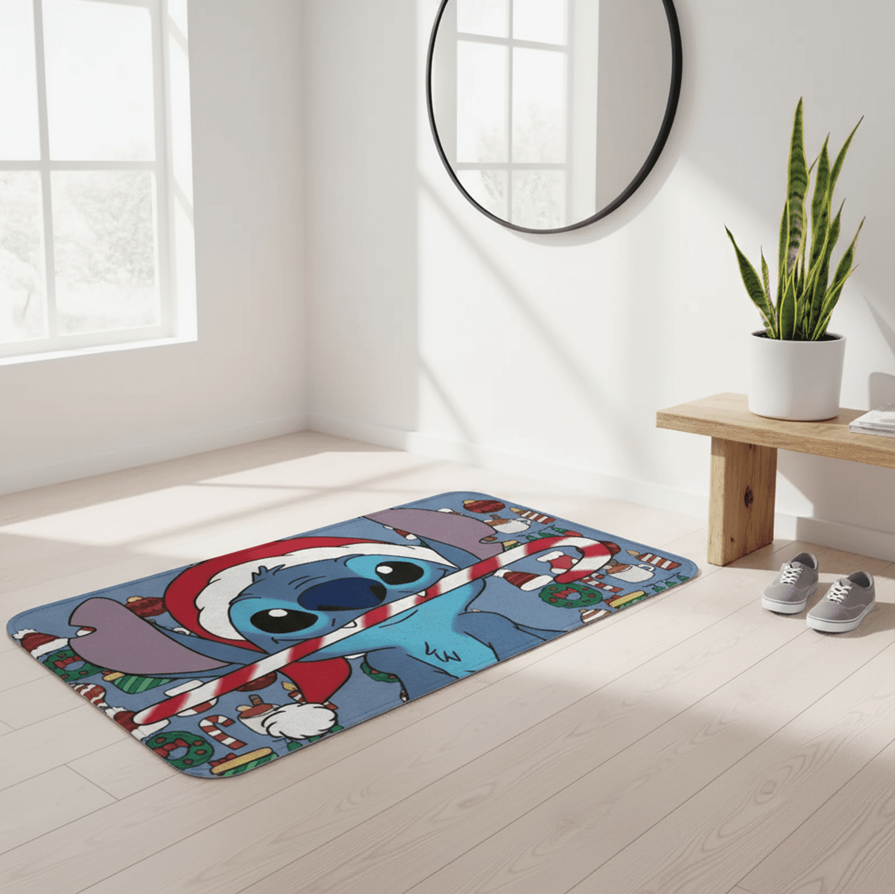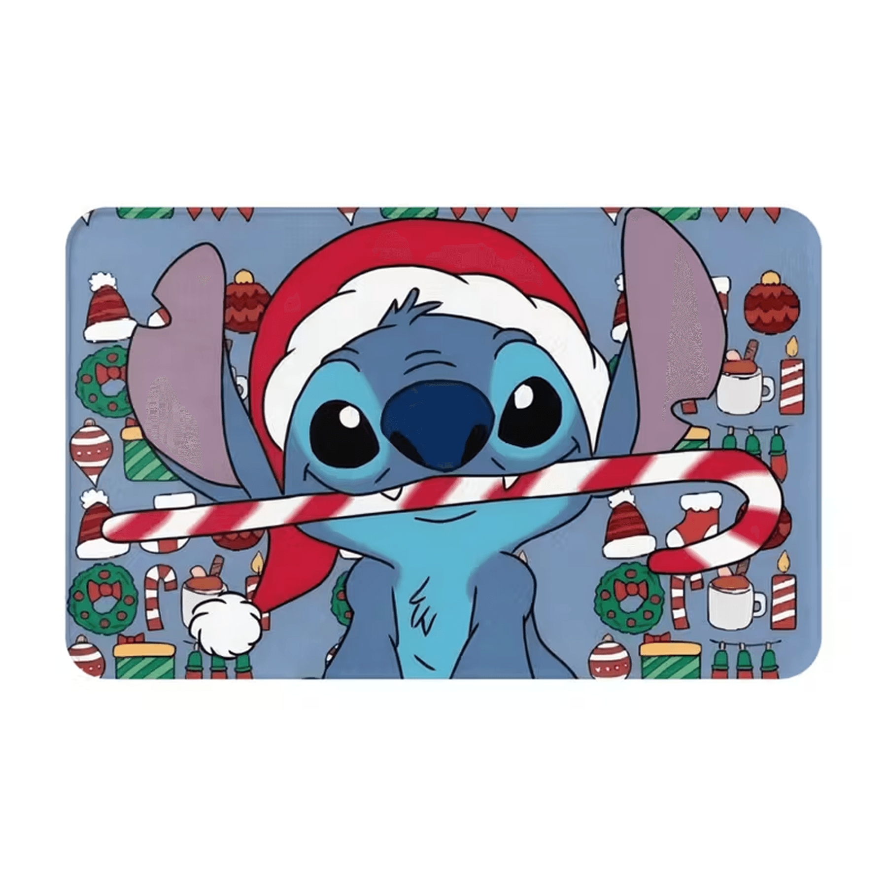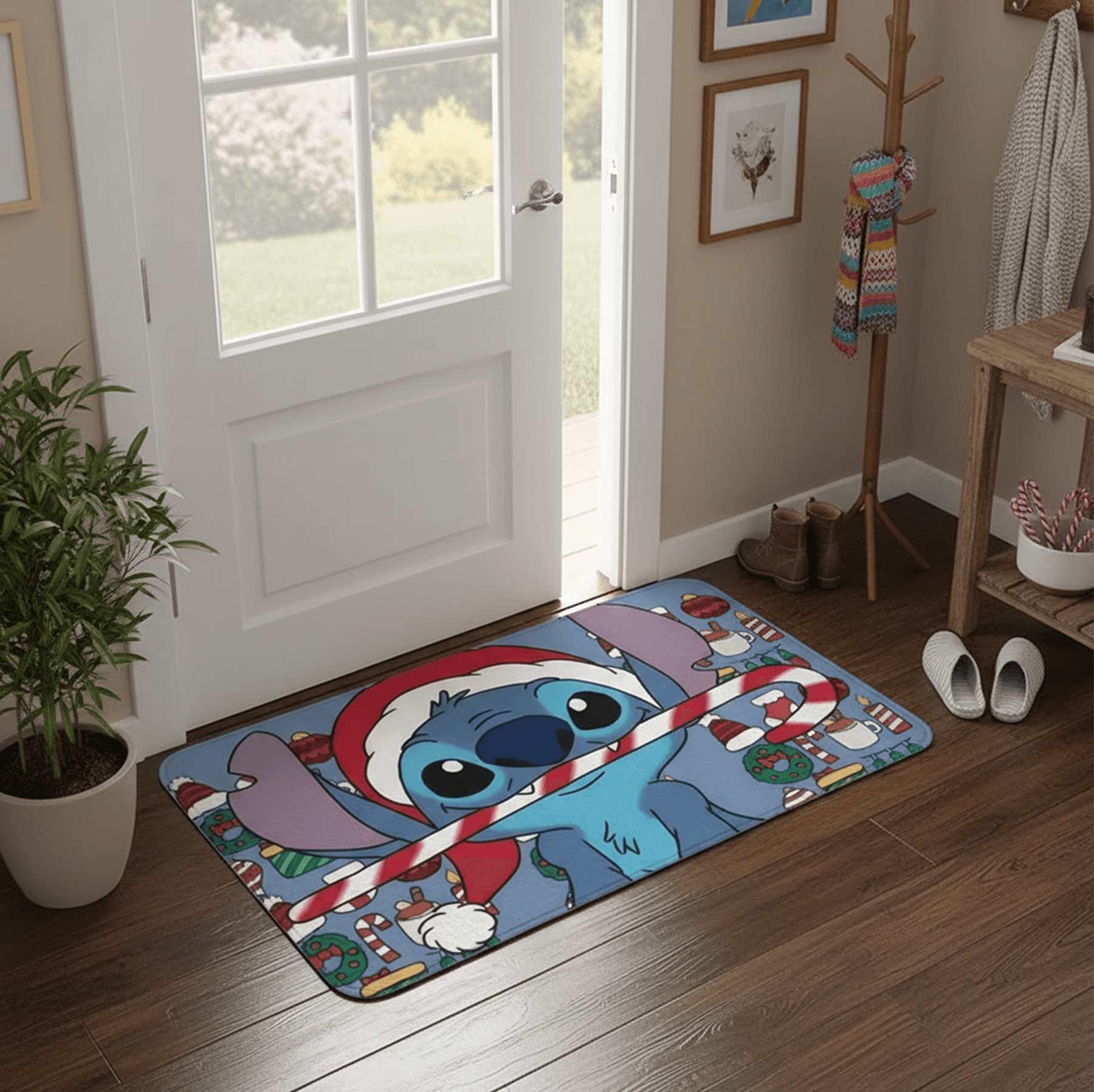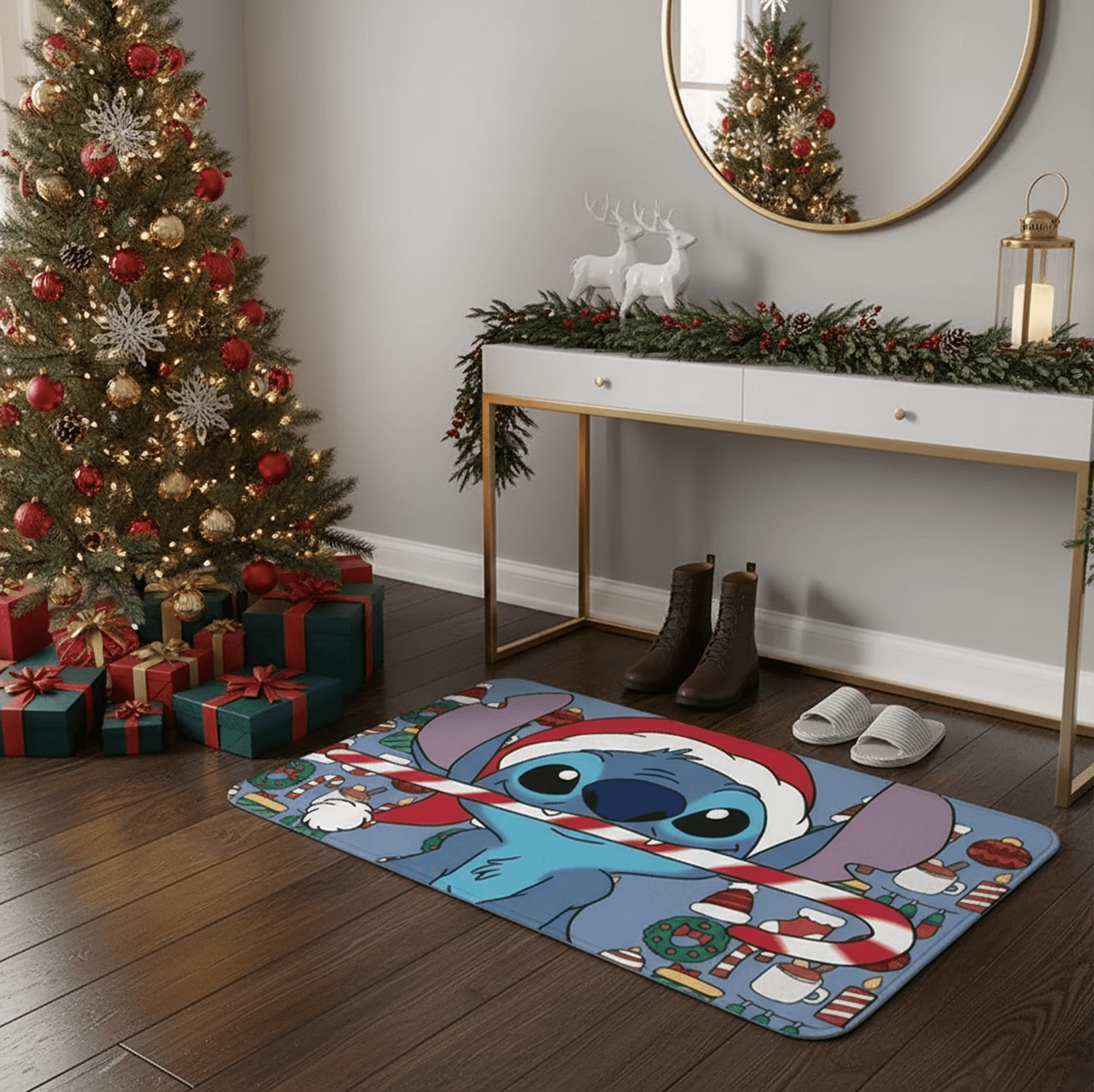 -Diseño Temático Navideño: Alfombra decorativa con Stitch en versión navideña, ideal para darle un toque divertido y festivo a cualquier espacio.