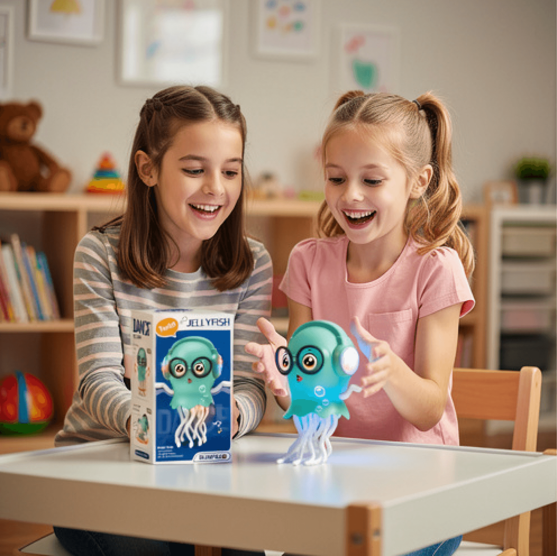 -Movimiento Interactivo: La medusa bailarina se mueve de forma rítmica, creando un efecto visual llamativo y divertido que capta la atención de niños y adultos.